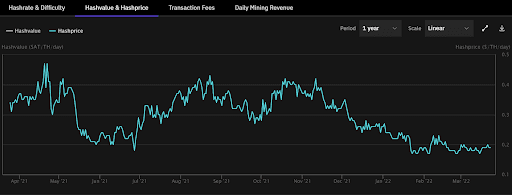 Hashprice (revenue per terahash) is ranging between $0.17 - $0.49 in the past year.